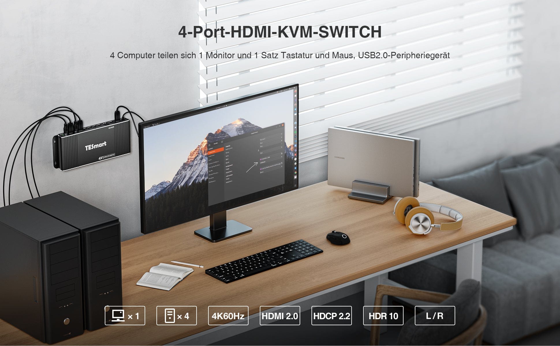 4 Port HDMI KVM Switch 4K60Hz mit USB Hub und Audio Out
