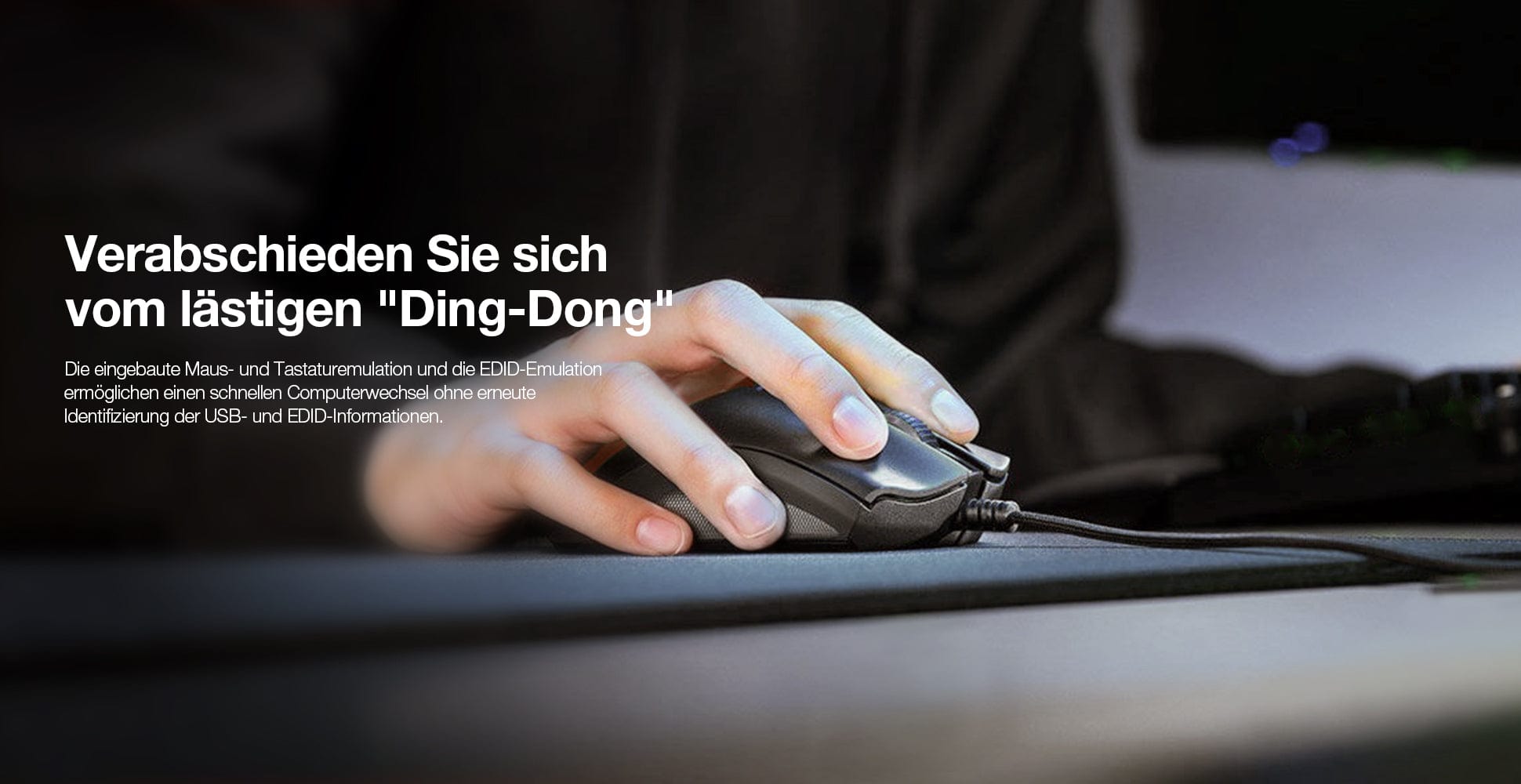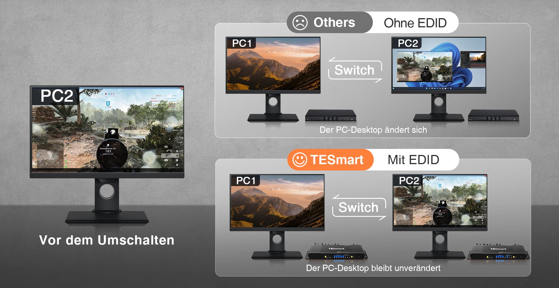 - Mit EDID-Emulatoren in jedem Eingangsport, damit der PC immer die korrekten Anzeigeinformationen hat.