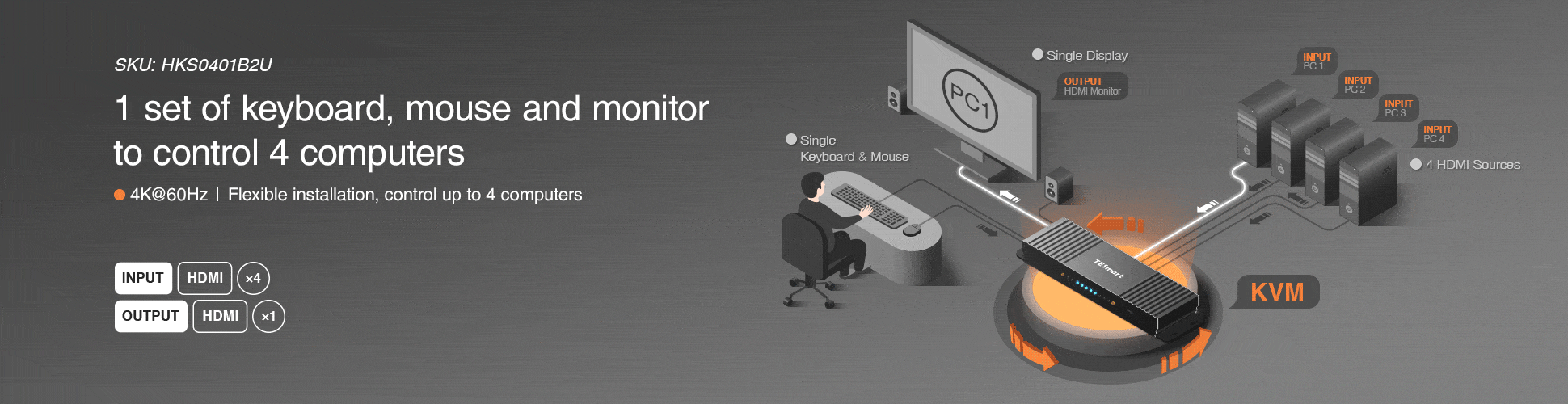 Der 4x1 HDMI KVM-Switch unterstützt USB 2.0-Geräte, Sie können sogar USB-Laufwerke, Drucker, Barcode-Scanner oder andere USB-Geräte an den KVM anschließen. Die Umschaltung kann über verschiedene Methoden gesteuert werden: Tasten an der Vorderseite, IR-Signale, Tastatur-Hotkeys und Mausgesten zur Steuerung des KVM, um Eingänge umzuschalten. Unterstützt analogen L/R-Audioausgang. Unterstützt den Tastatur- und Maus-Pass-Through-Modus zur Verbesserung der KM-Kompatibilität.