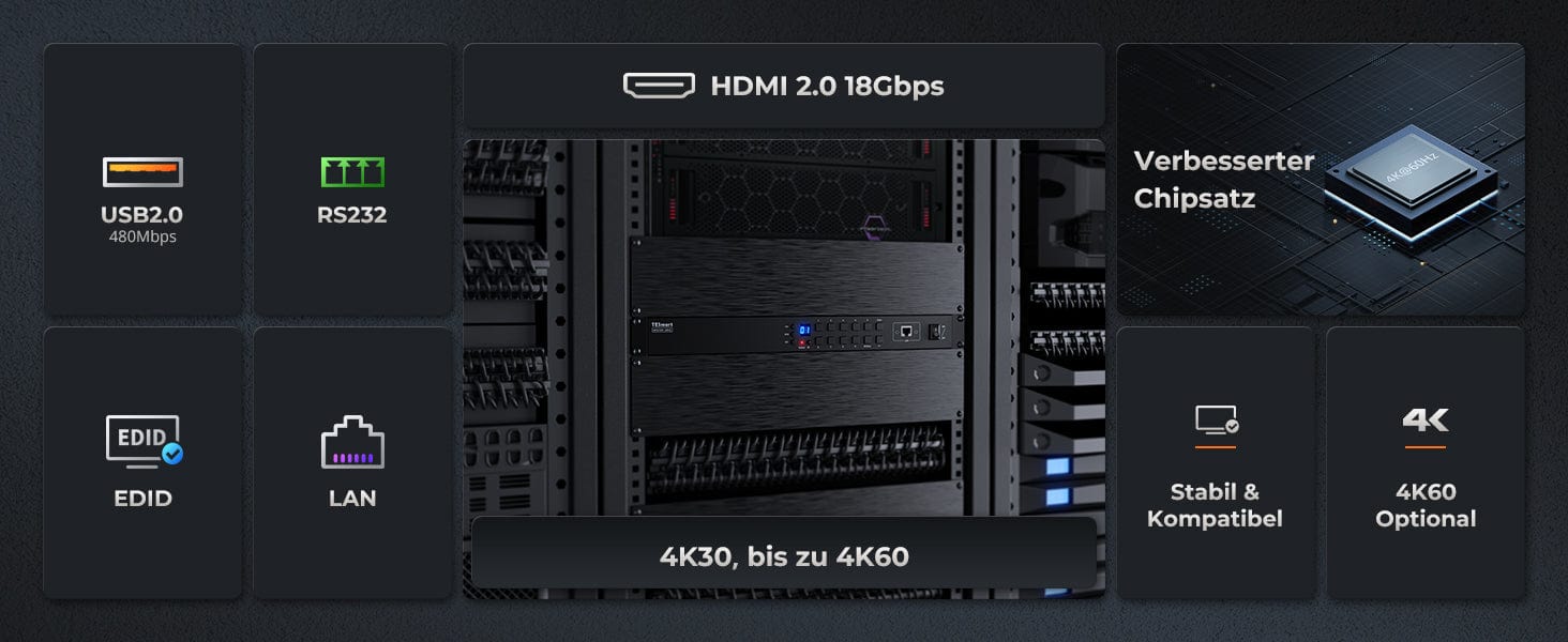 16-Port HDMI KVM Switch 4K30Hz mit Unterstützung für RS232/LAN, verbessert für erweiterte Kompatibilität und Stabilität