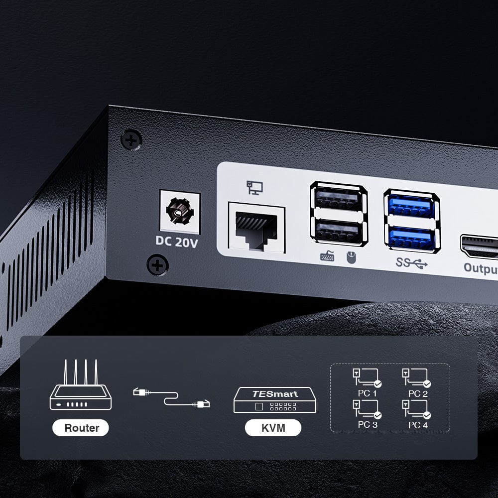 - Unterstützt verkabelte Netzwerkverbindung, 4 PCs, die mit dem KVM verbunden sind, können mit nur einem Netzwerkkabel auf das Netzwerk zugreifen.