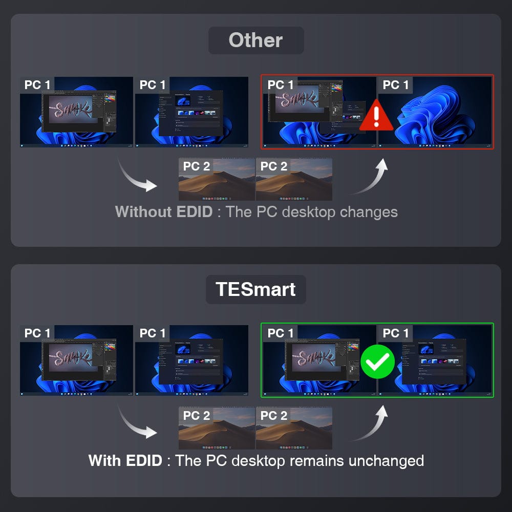 - EDID-Emulation: Mit EDID-Emulatoren in jedem Eingangsanschluss können PCs immer korrekte Anzeigeinformationen haben, um Auflösungs- und Icon-Neuanordnungen zu verhindern.