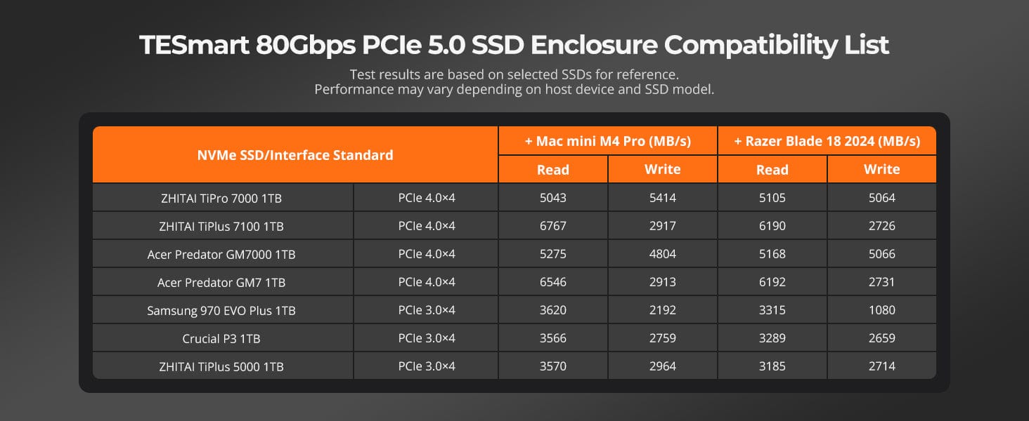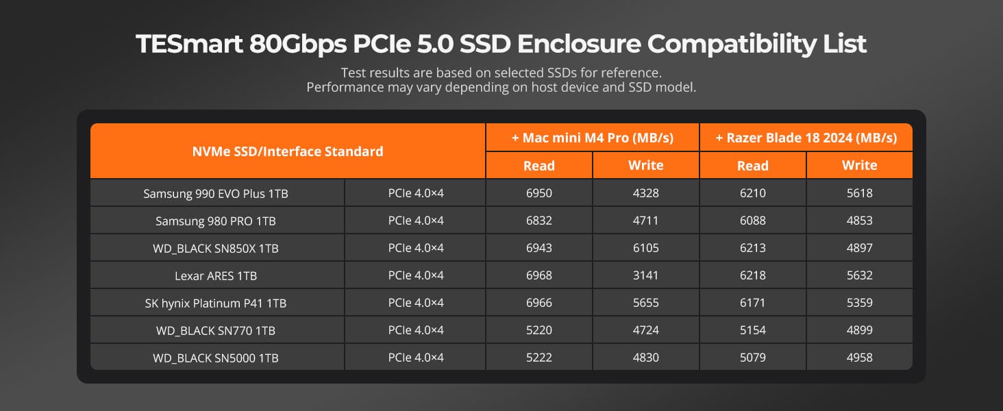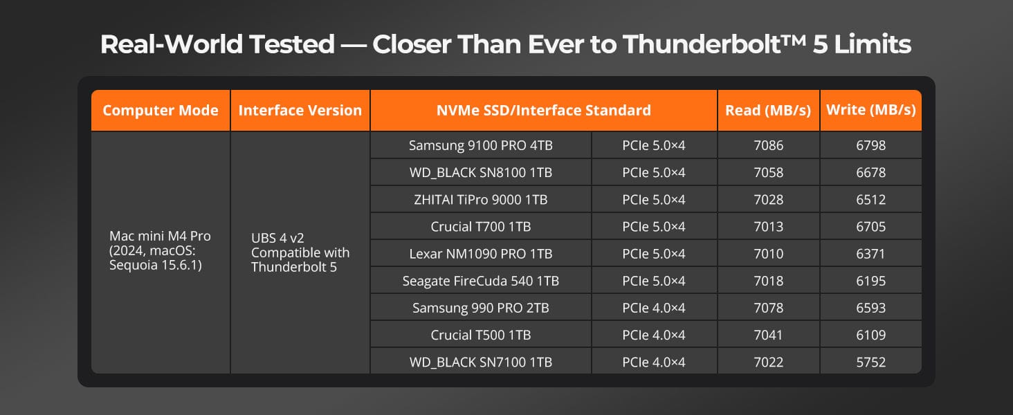 - Getestet mit Samsung 9100 Pro, WD SN8100, TiPro 9000, Crucial T700, Lexar NM1090 Pro, Samsung 990 Pro und mehr – inklusive Apple M4 Serie (MacBook Pro / Mac mini) für volle Geschwindigkeitsstabilität