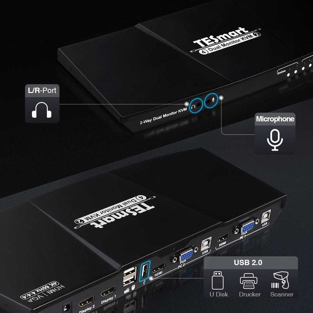 - Verbinden Sie jeden PC mit diesem KVM-Switch mit einem HDMI- und einem VGA-Ausgang für die Dual-Monitor-Funktionalität.