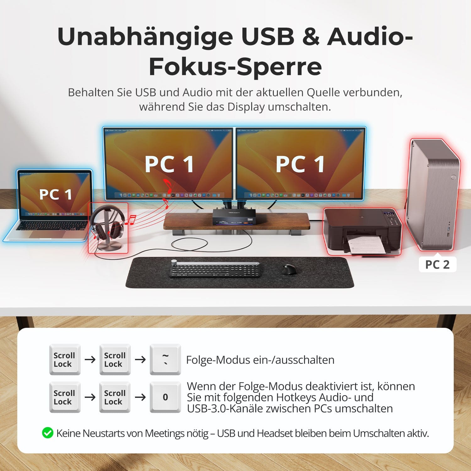 Mit diesem KVM können Sie den Fokus von USB 3.0 und L/R-Audio unabhängig sperren – so bleiben Headset, Webcam oder externe Laufwerke mit dem aktuellen PC verbunden, auch während des Bildschirmwechsels.