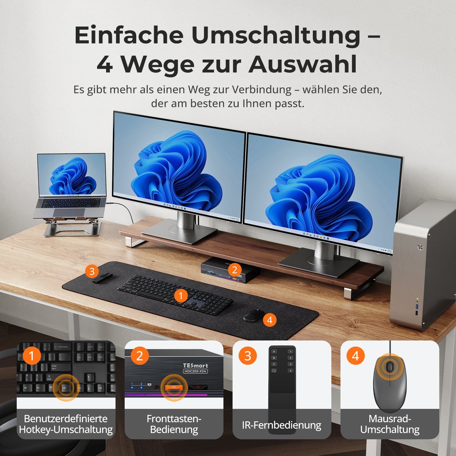 Der HDC202-X24 ist der erste Dual-Display-Thunderbolt-4-KVM auf dem Markt, mit Unterstützung für 2 PCs und 2 Monitore. Nahtloses Umschalten zwischen Thunderbolt-Laptops und Desktops – mit Dual 4K@60Hz und hohen Bildwiederholraten für Gaming. Integriertes 60W-Schnellladen, 1000Mbps-Ethernet und intelligente Umschaltung von Tastatur/Maus ohne Unterbrechung – die ultimative Lösung für hybrides Arbeiten & Gaming. EDID-Emulation verhindert Auflösungswechsel und Icon-Verschiebung.