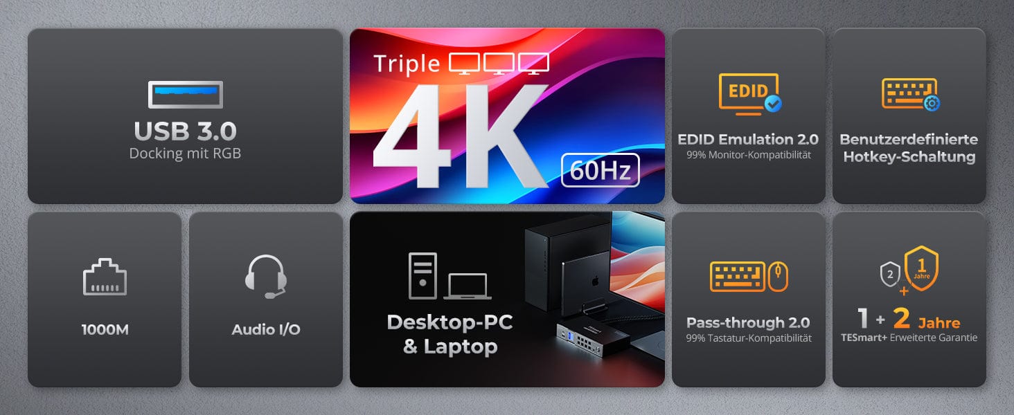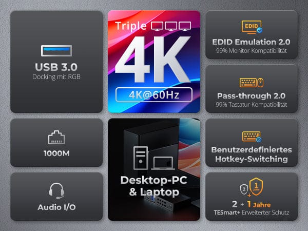TESmart HDC203-P24-EUBK Drei Monitor KVM Switcher Triple 4K60Hz Hybrid KVM Gaming Dock für 1 Desktop-PC und 1 Laptop, mit EDID, MST 10652805090730 EU Plug