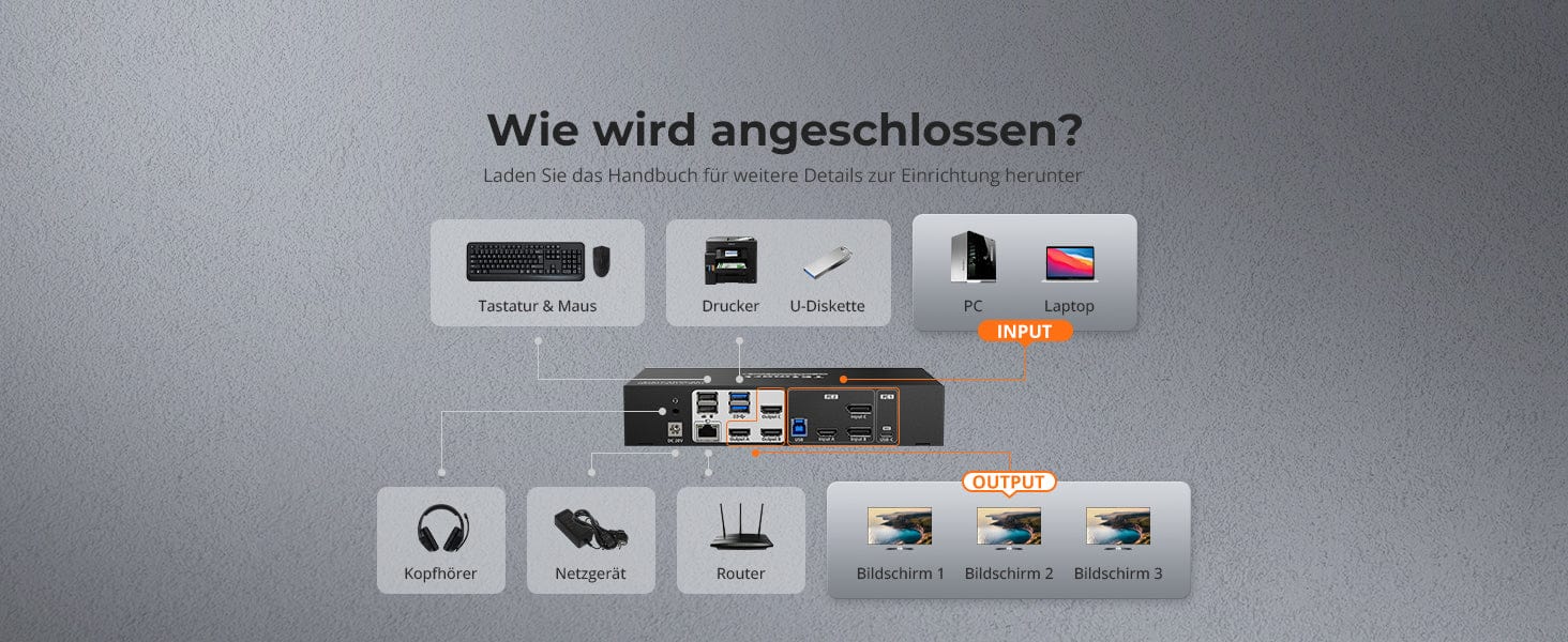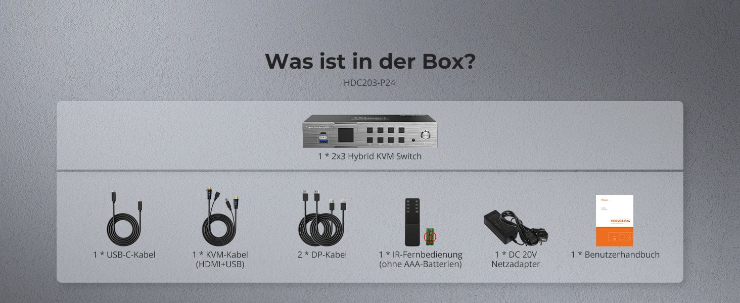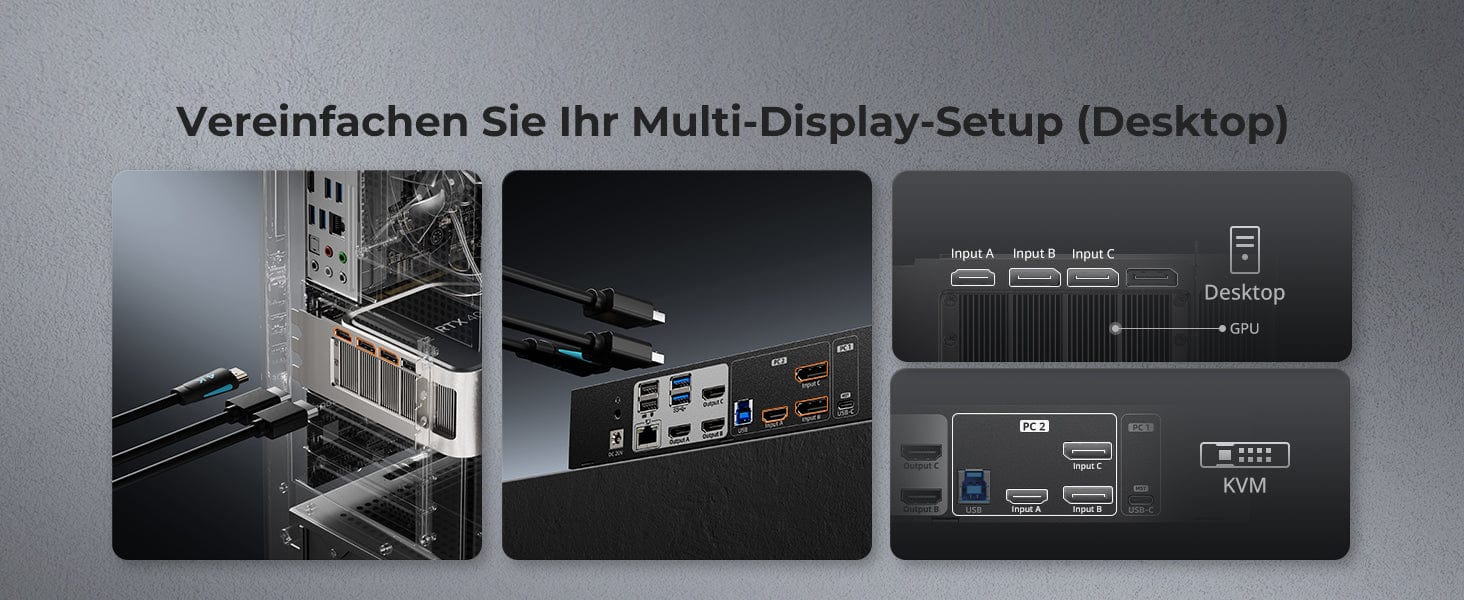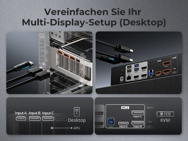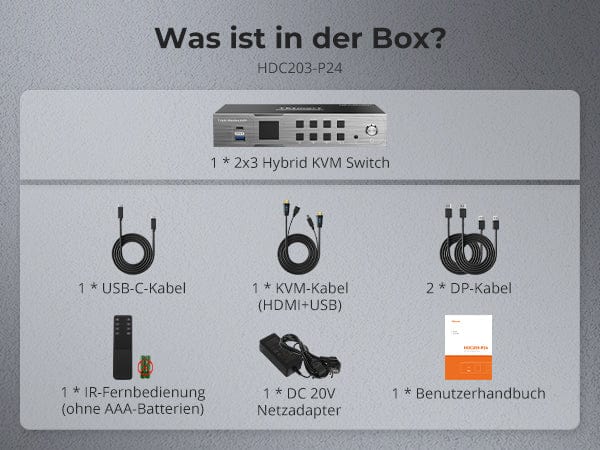 Das KVM-Switch-Kit wird mit vollständigen KVM-zu-PC-Kabeln (1 * USB-C-Kabel, 1 * KVM-Kabel und 2 * DP-Kabel) für eine komplette Einrichtung geliefert.
