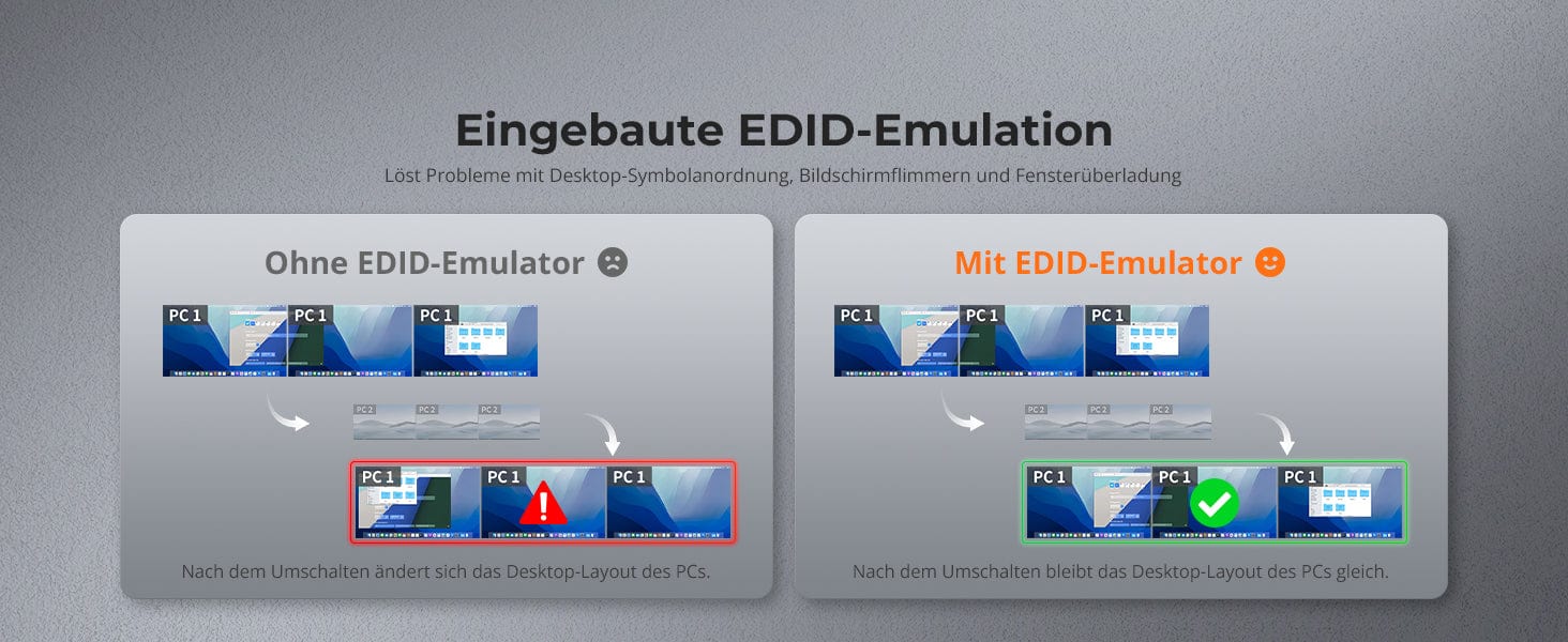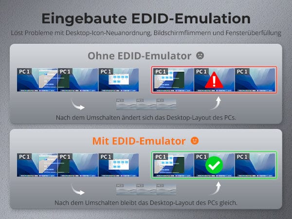 • Con emuladores EDID en cada entrada, se puede garantizar que las PC siempre tengan la información de visualización correcta.