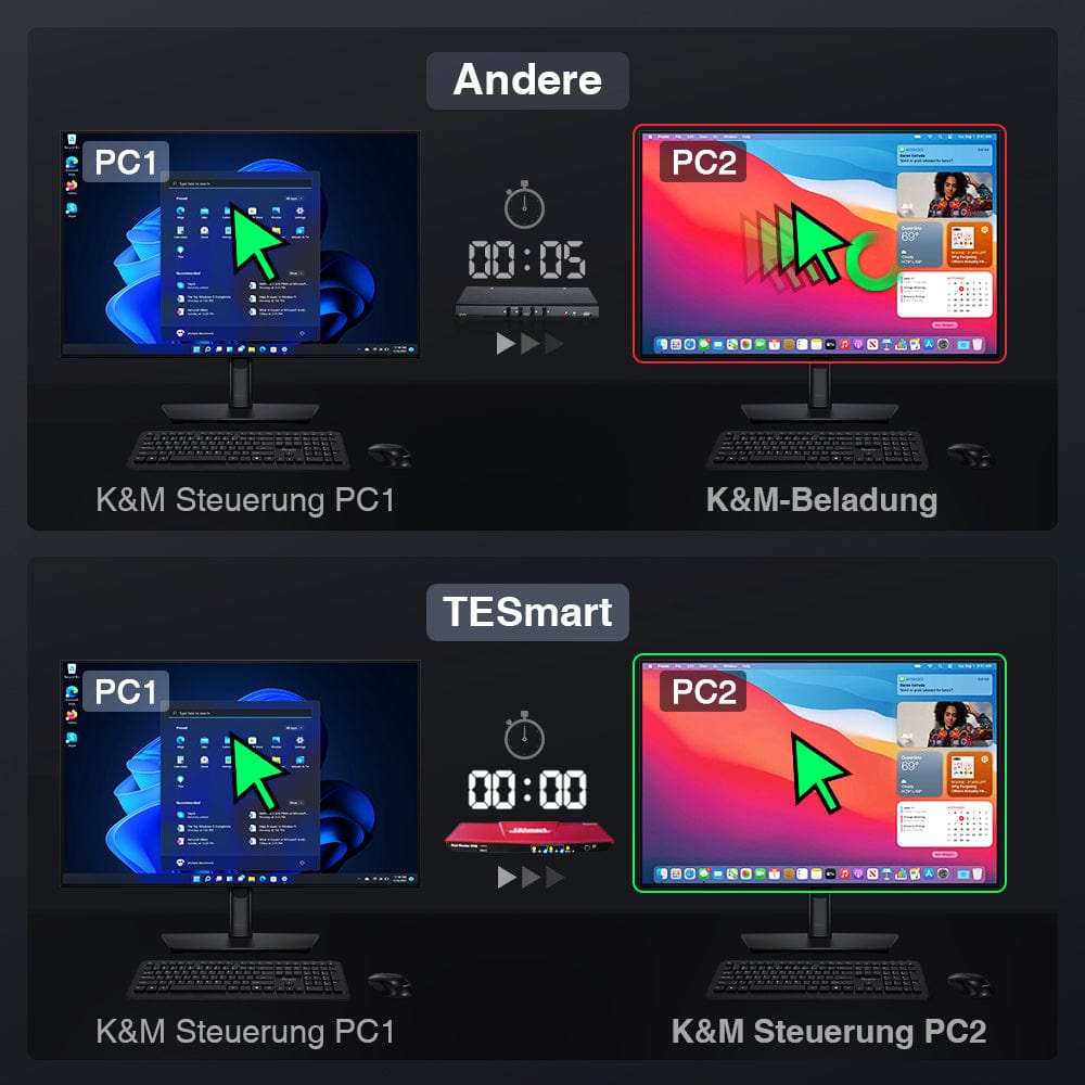 - Effiziente Verwaltung von zwei PCs mit einem Satz Tastatur, Maus und zwei 4K30Hz-Displays.