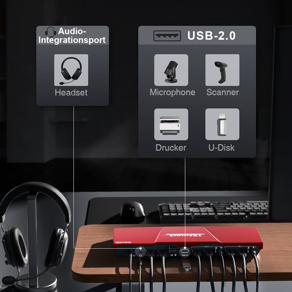 Erleben Sie den Komfort einer bidirektionalen Headset-Verbindung und die nahtlose gemeinsame Nutzung von USB 2.0-Geräten durch mehrere Systeme. Dies vereinfacht nicht nur die Einrichtung, sondern steigert auch die Produktivität und ist somit ideal für den Einsatz zu Hause, im Büro oder in der Ausbildung.