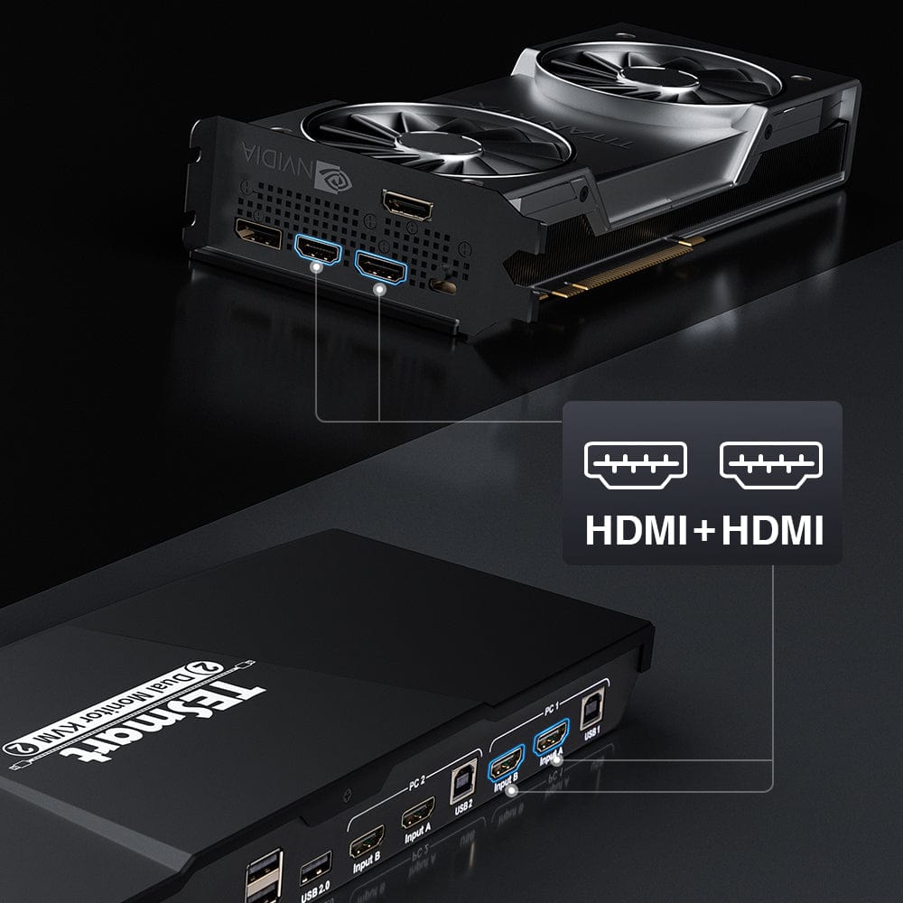 - Verbinden Sie jeden PC mit diesem KVM-Switch mit einem HDMI- und einem HDMI-Ausgang für Dual-Monitor-Funktionalität.