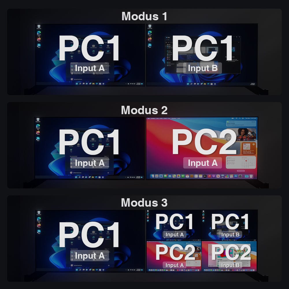 - Genießen Sie die Flexibilität von 3 Anzeigemodi: Dual-Monitor, Matrix und Thumbnail-Anzeige mit OSD.