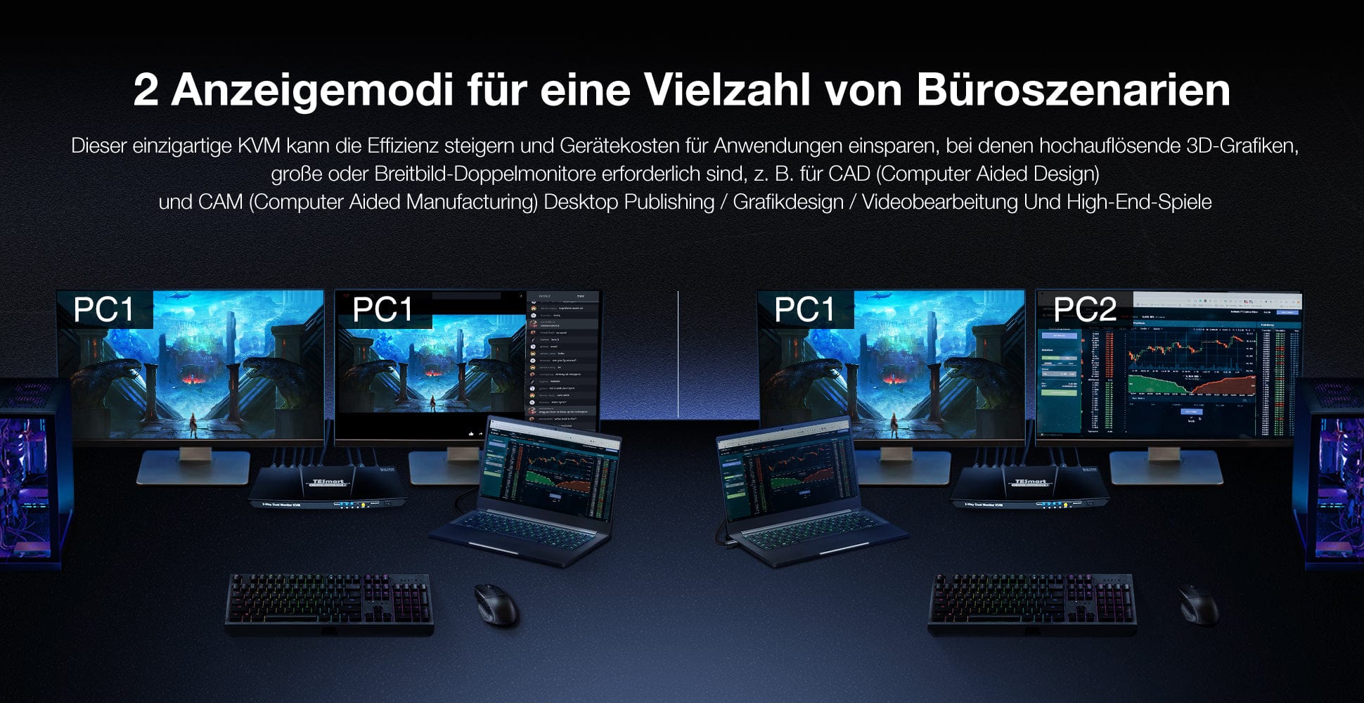 TESmarts KVM-Switch-Produkte ermöglichen nicht nur den Wechsel zwischen mehreren Computern, sondern verfügen auch über einzigartige Anzeigemodi. In diesem Blogbeitrag werden die vier Anzeigemodi der KVM-Switch-Produkte von TESmart vorgestellt: Mirror-Modus, Extended-Modus, Split-Screen-Modus und Picture-in-Picture-Modus. Es wird erklärt, wie sie in verschiedenen Szenarien eingesetzt werden können.
