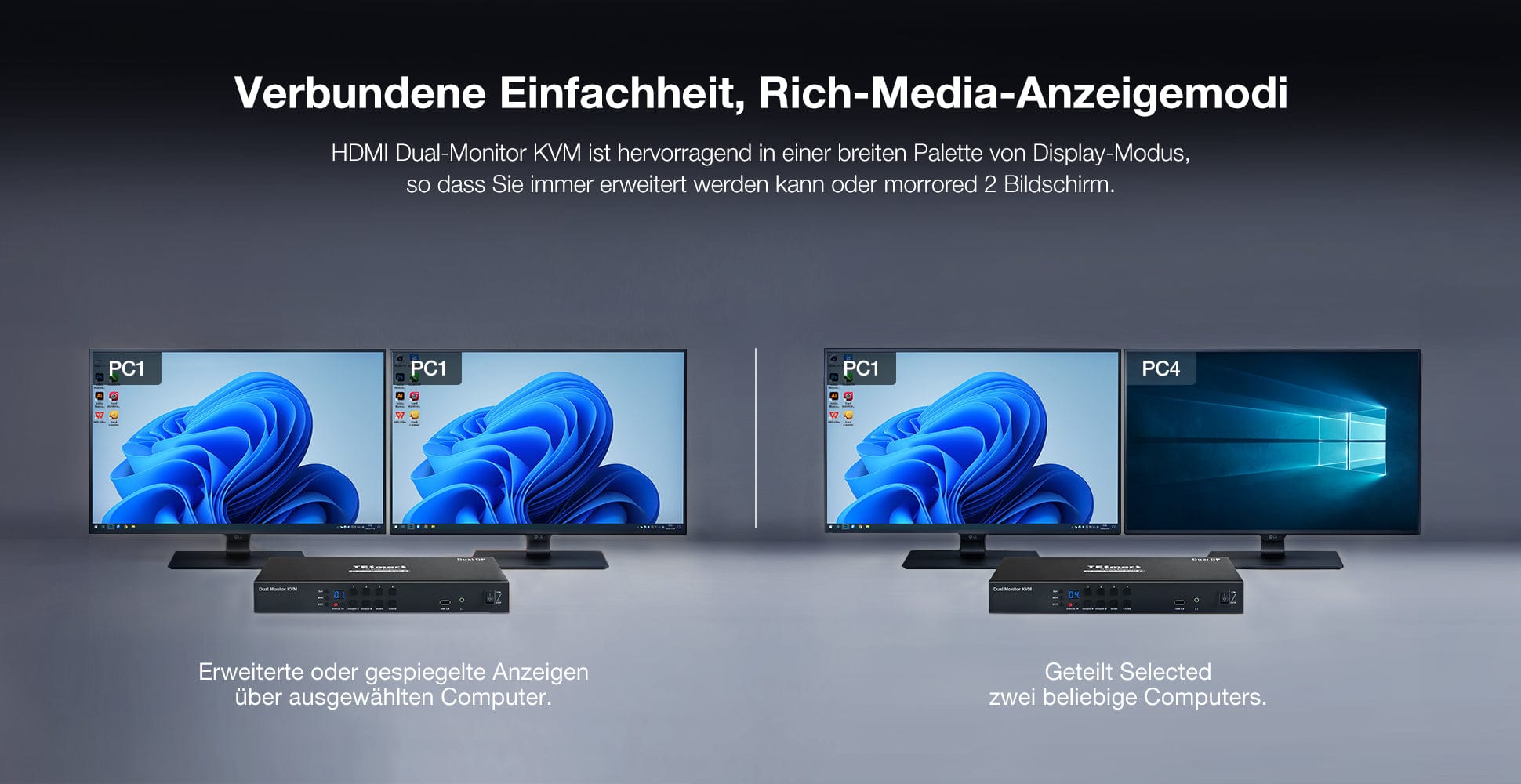 Der Extended-Modus ist ein weiterer einzigartiger Anzeigemodus der KVM-Switch-Produkte von TESmart. In diesem Modus können mehrere Computer an dasselbe Display angeschlossen werden, wodurch der Bildschirmplatz auf mehrere Bildschirme erweitert wird. Dieser Modus wird in der Regel in Szenarien wie Multimedia-Bearbeitung, Softwareentwicklung und anderen Szenarien verwendet, in denen mehrere Bildschirme gleichzeitig genutzt werden müssen.