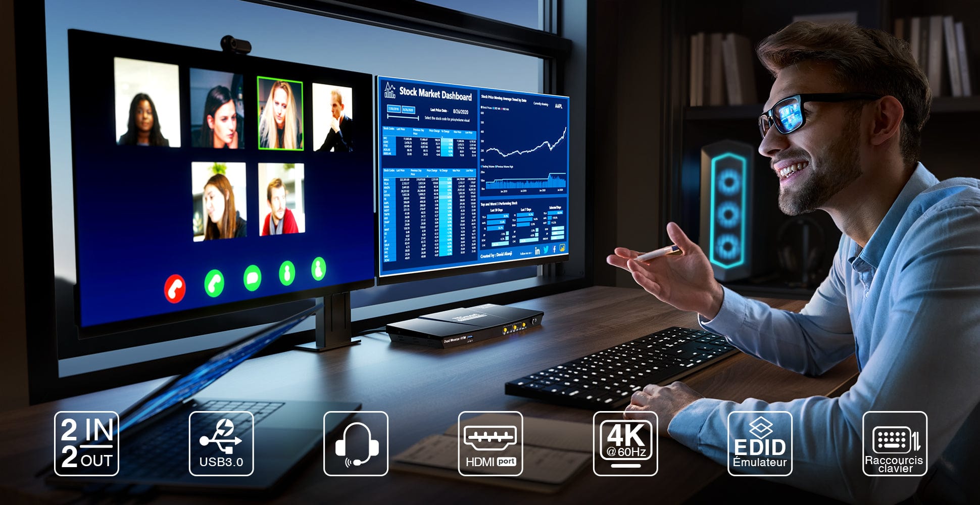 Kit de commutateur KVM double moniteur 2 ports HDMI+DP 4K60Hz avec station d'accueil USB 3.0, EDID€264,40 Voir les détails | |||||