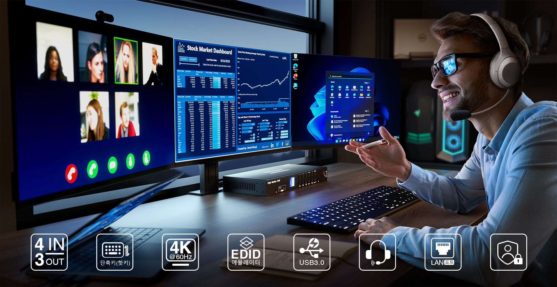 - Gérez efficacement 4 PC avec un seul ensemble de clavier, de souris et de trois écrans 4K60Hz.