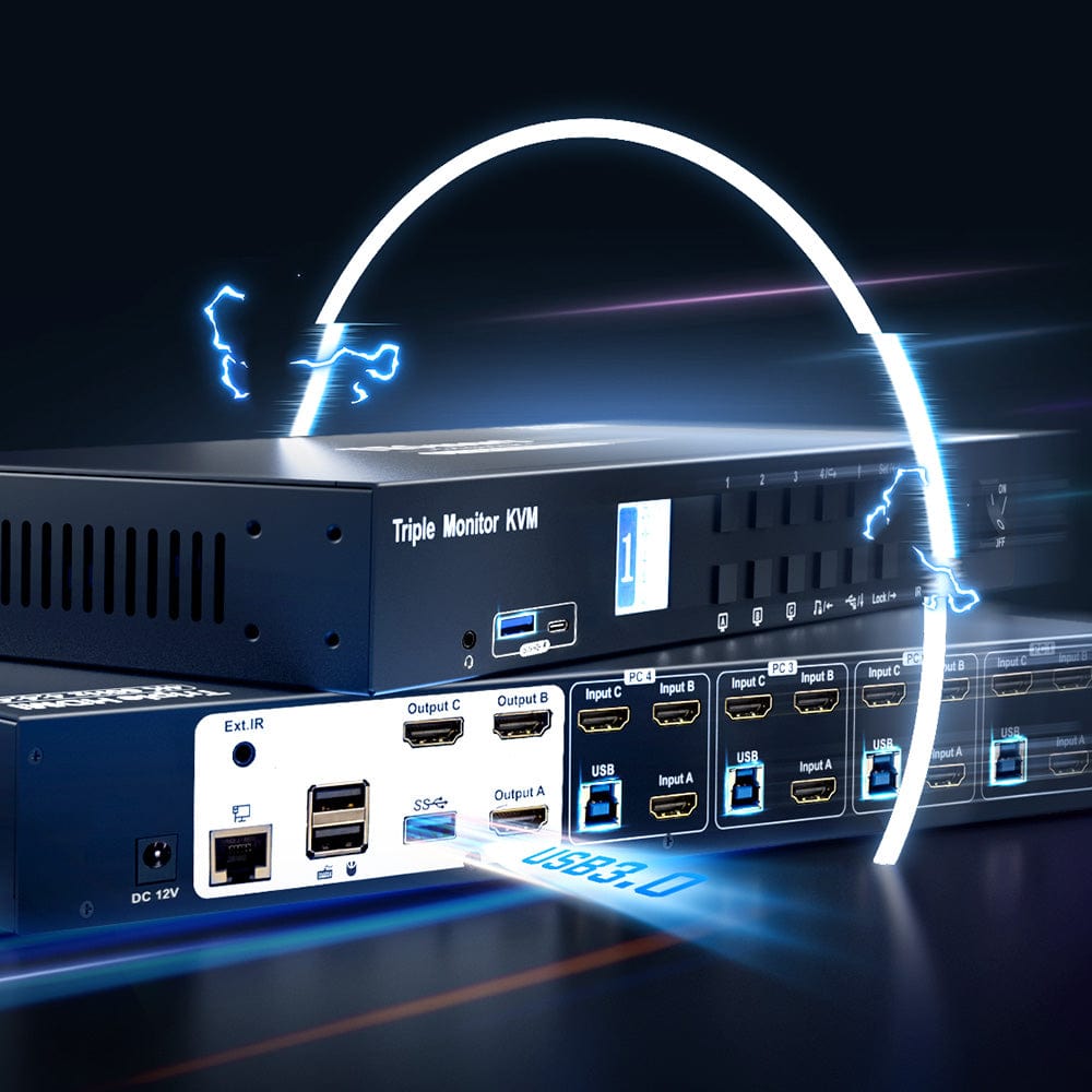 Ce commutateur KVM HDMI à trois écrans avec émulateur EDID intégré offre une compatibilité maximale : écrans 4K, ultra-larges et à taux de rafraîchissement élevé. Améliorez votre expérience visuelle dès aujourd’hui !