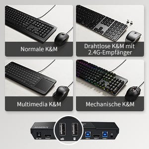• Verbinden und Umschalten von nicht-PC Geräten wie Spielekonsolen, Streaming-Boxen, NVRs usw.Kompatibel mit den meisten kabelgebundenen, drahtlosen, mechanischen und Gaming-Tastaturen.