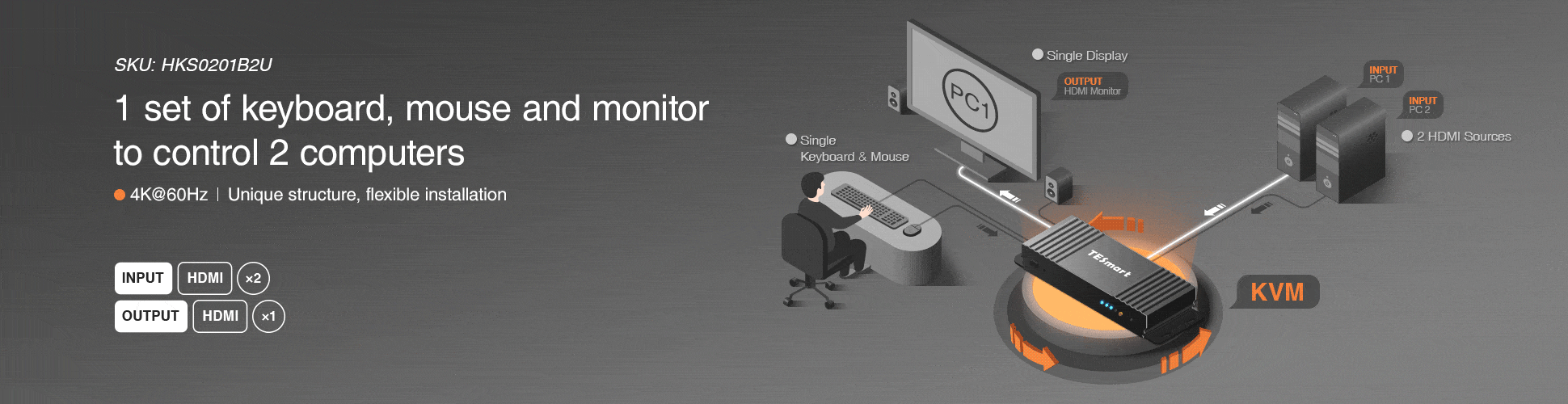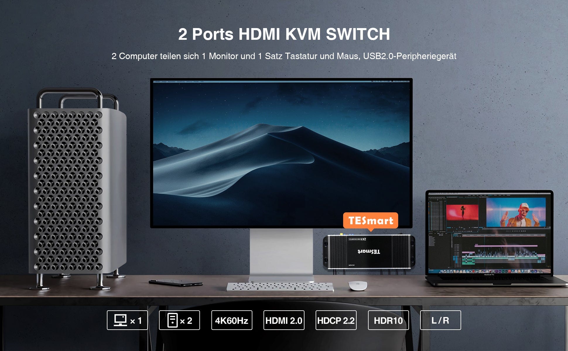 Dieser 2x1-HDMI-KVM-Switch bietet Ihnen große Flexibilität bei der einfachen Integration von plattformübergreifenden Computergeräten. Er ermöglicht es Ihnen, einfach und zuverlässig zwischen beliebigen HDMI-Computern mit einem HDMI-kompatiblen Display umzuschalten.