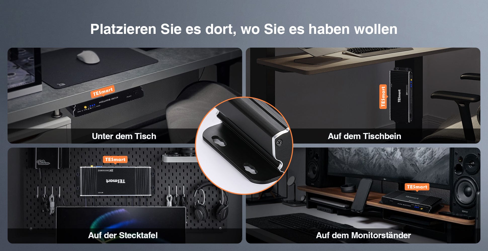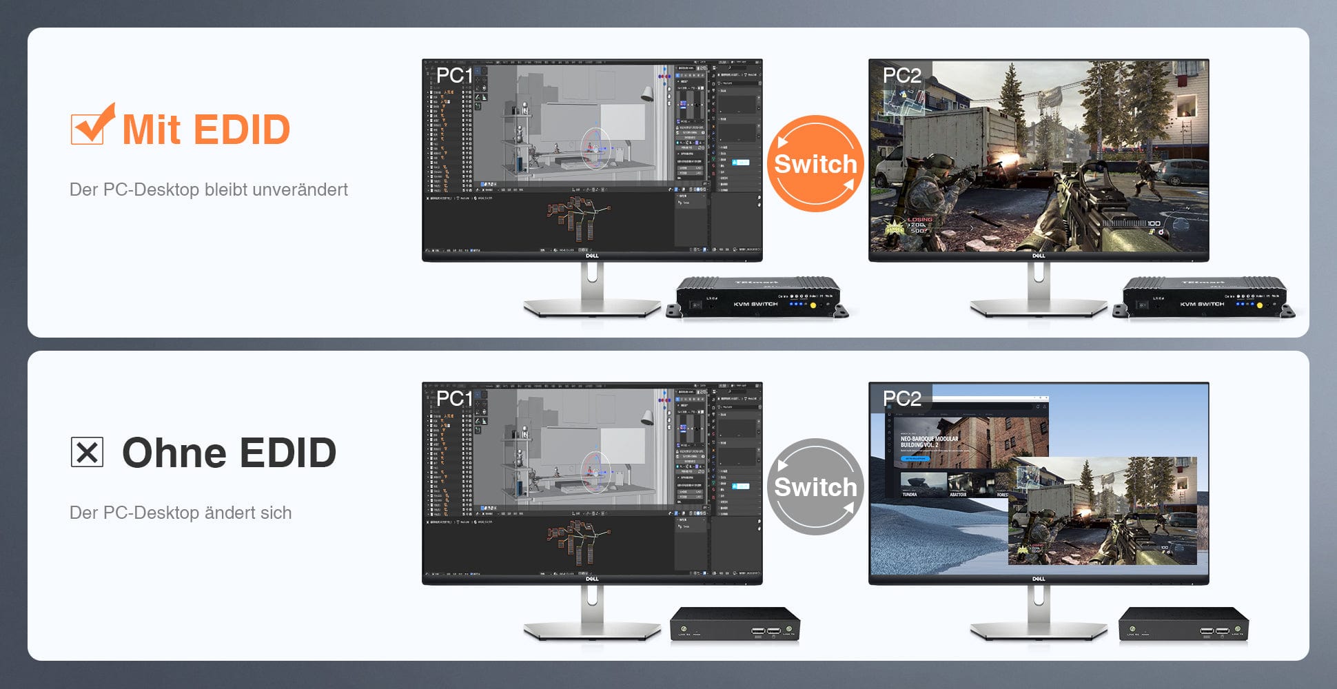 - Mit EDID-Emulatoren in jedem Eingangsport, damit der PC immer die korrekten Anzeigeinformationen hat.