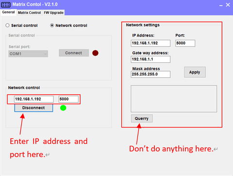 • Wählen Sie "Network Control" aus, geben Sie die IP-Adresse "192.168.1.10" und den Port "5000" ein, klicken Sie dann auf die Schaltfläche "Connect" und warten Sie, bis das rote Symbol grün wird