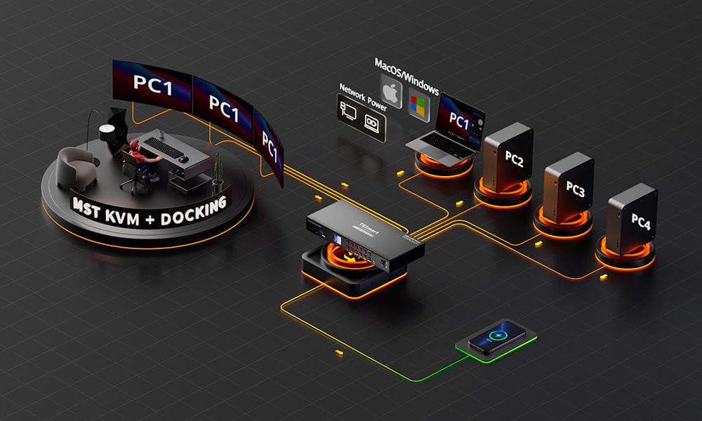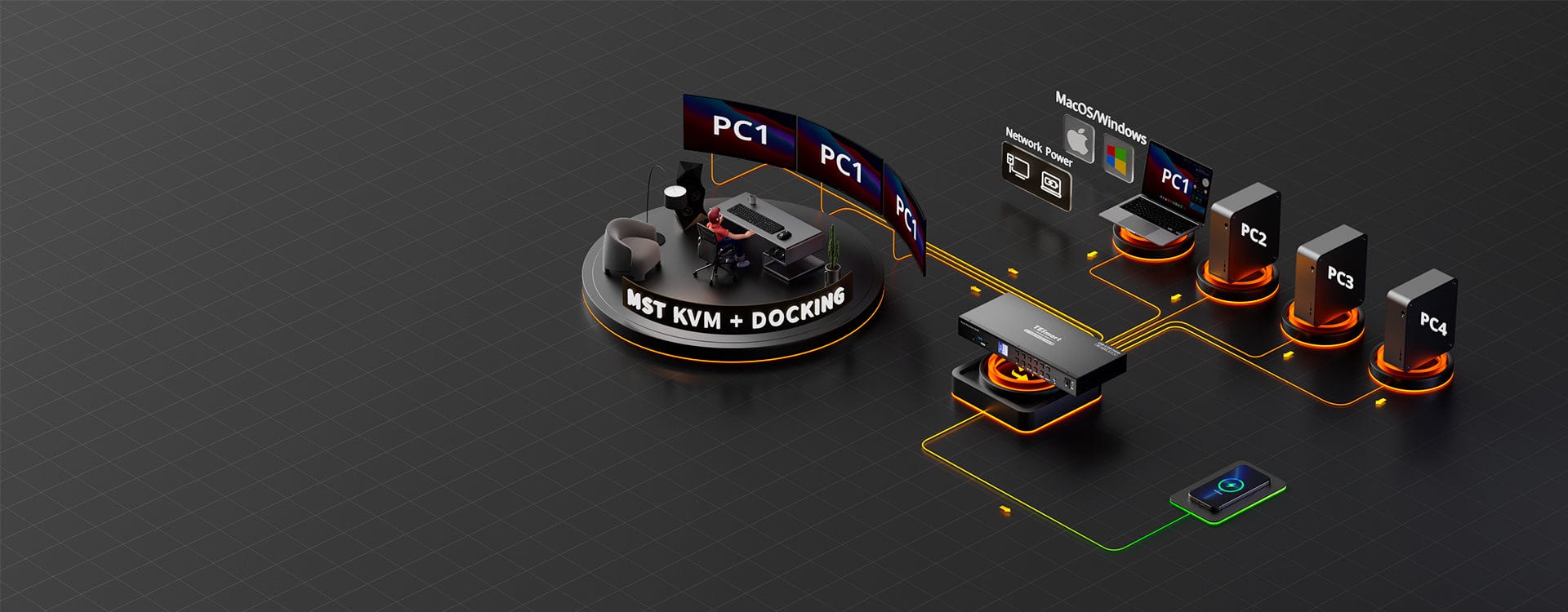 - Der traditionelle Triple-Monitor-KVM-Schalter erfordert das Anschließen von 3 Kabeln an jedes Eingabegerät für die normale Triple-Monitor-Funktionalität. Wir haben Innovationen eingeführt: PC1 & PC2 unterstützen den Multi-Stream-Transport (MST)-Modus, der das Anzeigen von Triplefachen HDMI-Bildschirmen von einer einzigen Quelle ermöglicht. PC3 & PC4 behalten das klassische Design bei, um die KVM-Kompatibilität mit mehr Szenarien sicherzustellen und Triplefache Anzeigen durch direktes Anschließen von 3 HDMI-Ausgängen zu erreichen.