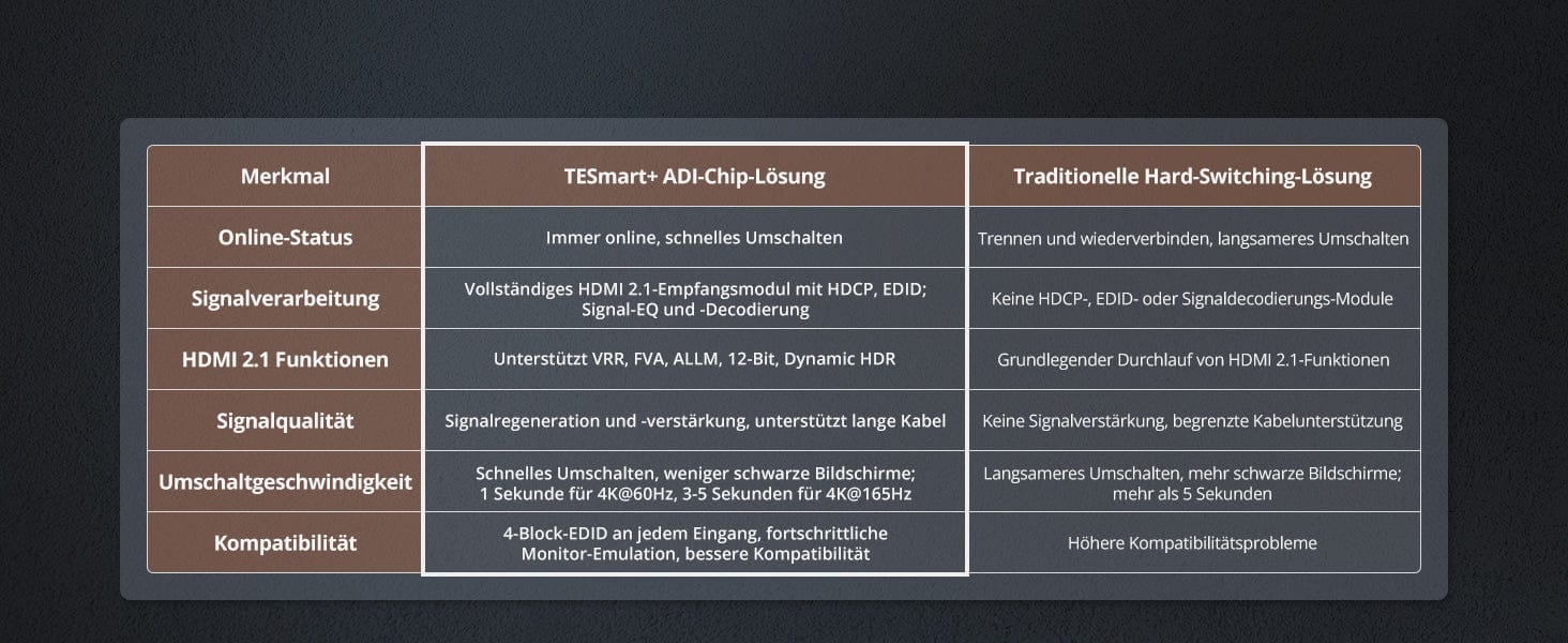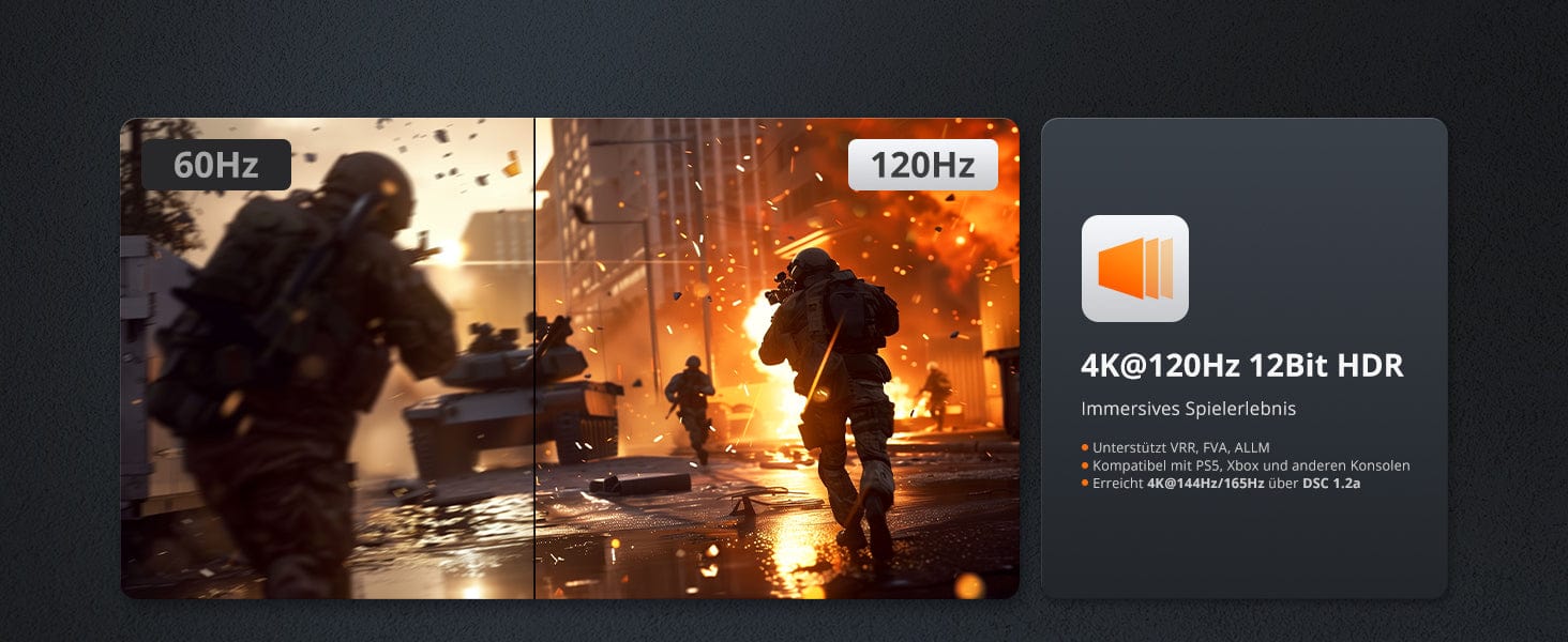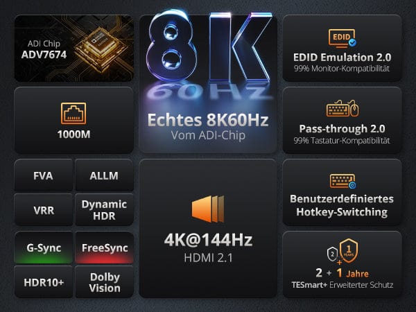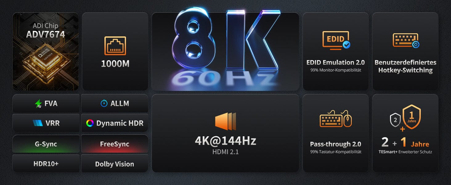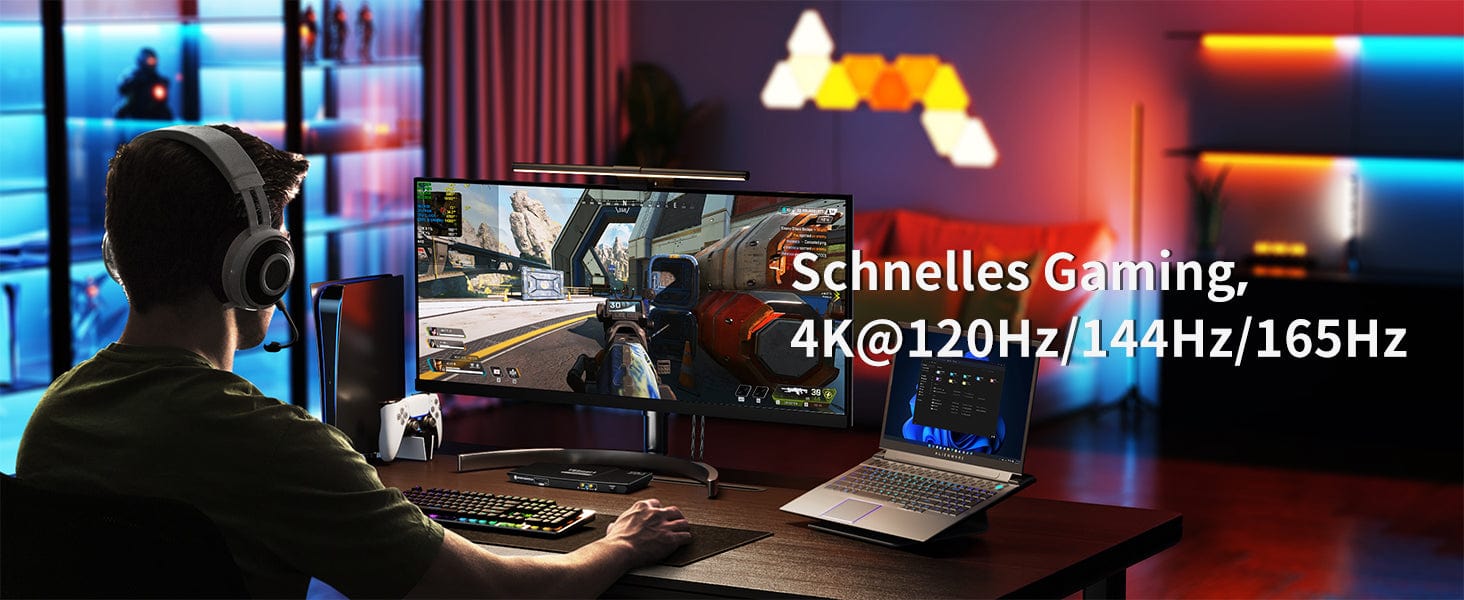 - Schnelles Umschalten, weniger Bildschirmausfälle; 1 Sekunde für 4K@60Hz, 3~5 Sekunden für 4K@165Hz