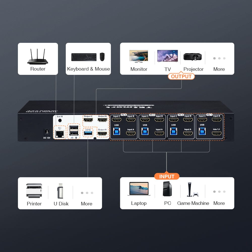 - Der Switch muss Videosignale an drei HDMI-Eingängen pro PC für die dreifache Monitorausgabe empfangen.