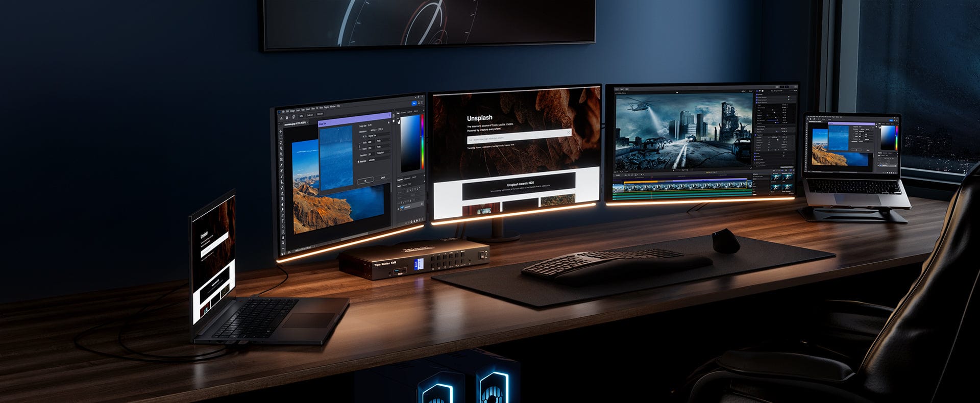 - Effiziente Verwaltung von 4 PCs mit einem Satz von Tastatur, Maus und drei 4K60Hz-Displays.
