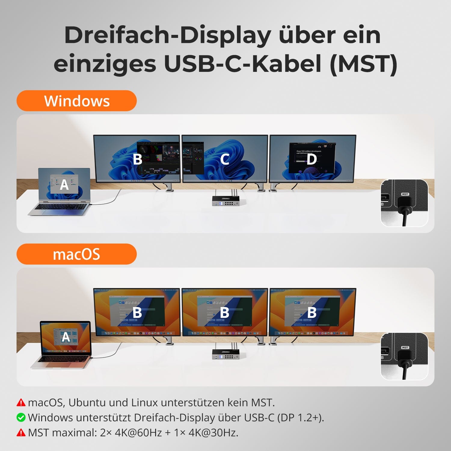 ⚠️ MST maximal: 2×4K60Hz + 1×4K30Hz