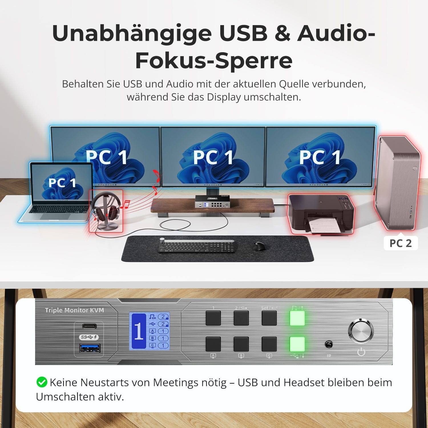 Mit diesem KVM können Sie den Fokus von USB 3.0 und L/R-Audio unabhängig sperren – so bleiben Headset, Webcam oder externe Laufwerke mit dem aktuellen PC verbunden, auch während des Bildschirmwechsels.