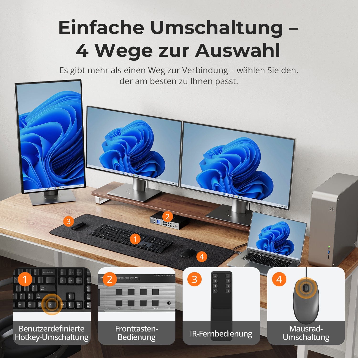 Umschalten darf Sie nicht ausbremsen – wir bieten vier nahtlose Methoden, die zu jedem Setup und jeder Arbeitsweise passen: