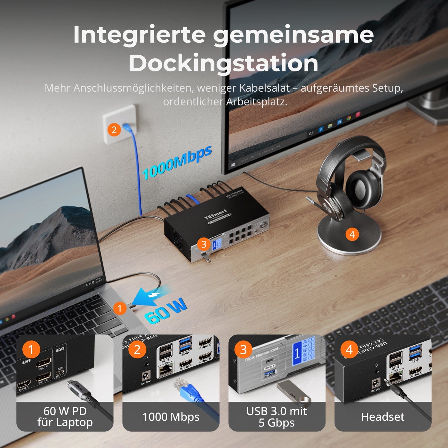 • 60 W USB-C PD – Versorgt Ihr Laptop während der Arbeit mit Strom