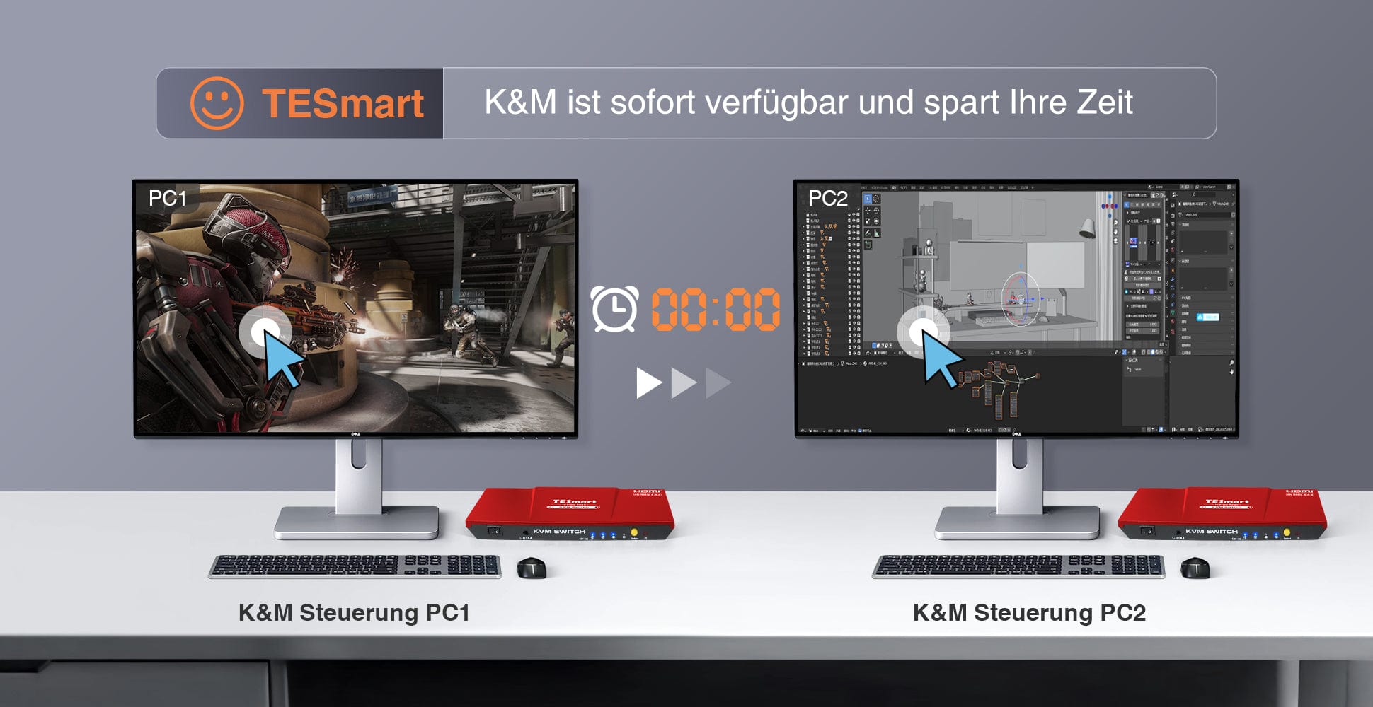 - Verwendung von nur 1 Satz Tastatur, Maus und Monitor zur Steuerung von 2 PCs.